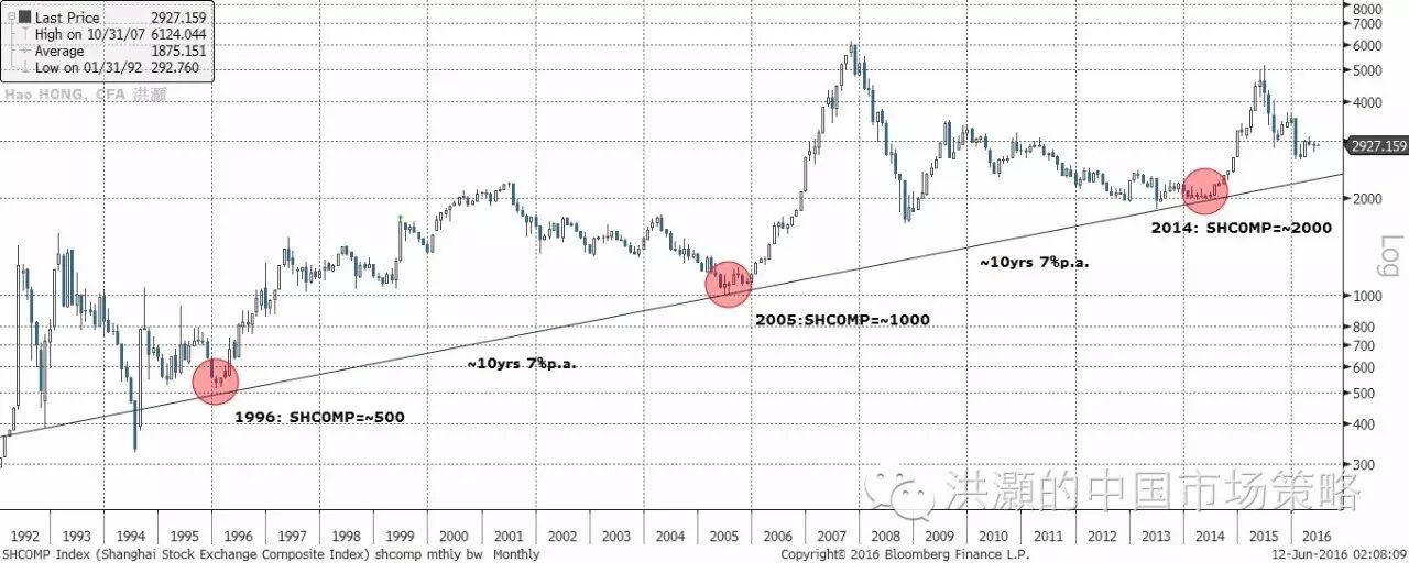Focus Chart 6: The Shanghai Composite has been growing at 7%, doubling roughly every decade. 2016 support = ~2,500.